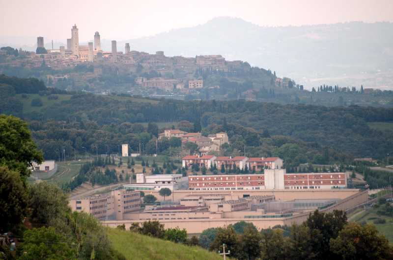 Mitten in der Toskana entdeckten wir plötzlich ein Gefängnis. Etwas später konnten wir diese interessante Bildkomposition fotographieren: Macht im Mittelalter und Macht in der Neuzeit.